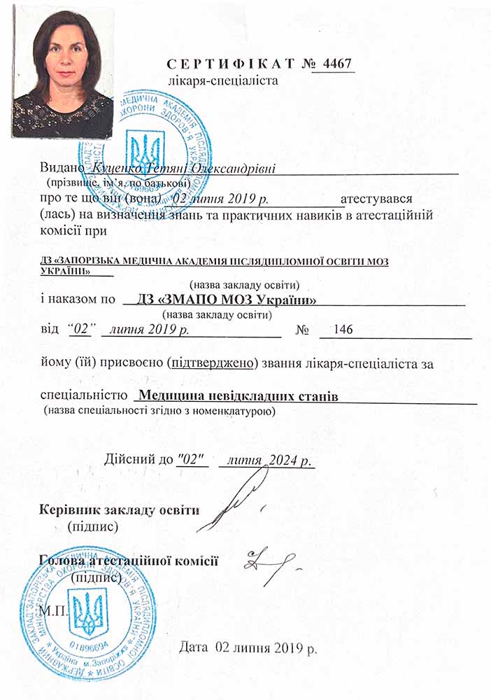 Куценко Тетяна Олександрівна — кваліфікований лікар із наркології та медицини невідкладних станів із загальним медичним стажем понад 18 років. Володіє унікальним поєднанням компетенцій: глибоке розуміння невідкладної допомоги та багаторічний досвід лікування залежностей дають змогу ефективно працювати з пацієнтами будь-якої складності — від гострих кризових станів до тривалої реабілітації.
