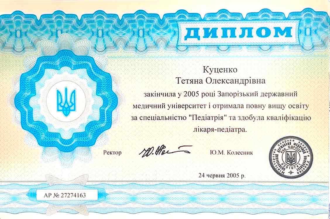 - 1999–2005 — Запорізький державний медичний університет, спеціальність «Лікувальна справа».
