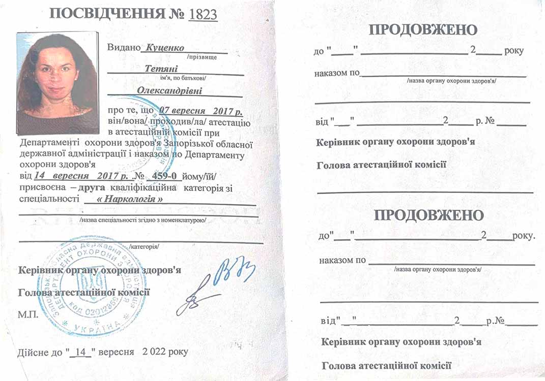 - 2015 — Присвоєно другу кваліфікаційну категорію з наркології.